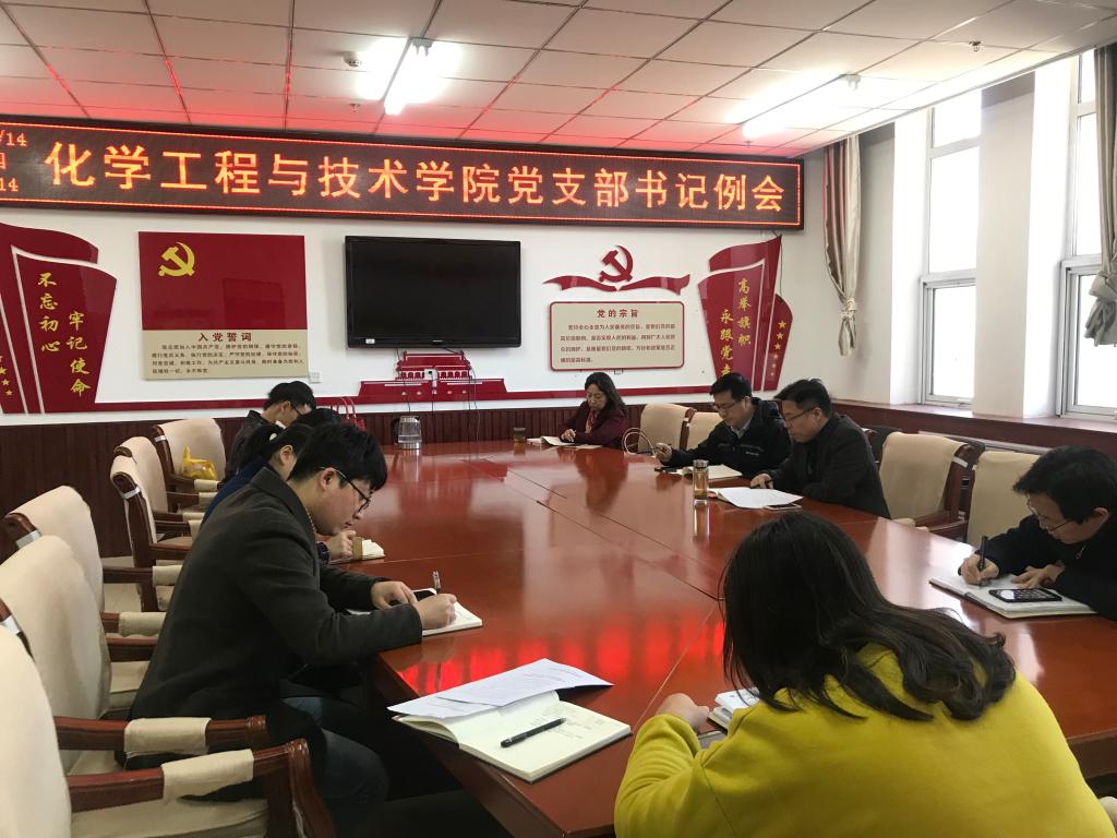 为落实省委、校党委关于“改革创新、奋发有为”大讨论实施方案的相关要求,化学工程与技术学院于2019年3月14日下午,在科学楼705党员之家召开了学院党支部书记例会,会议由院党委书记廖海洪主持,院党委副书记李云及全体党支部书记参会。