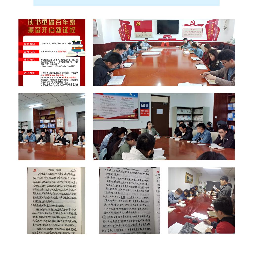 为增进党员不忘初心、砥砺进取的信念,加强党员对党史的学习,化学工程与技术学院硕士研究生党支部开展了“读书重温百年路,振奋开启新征程”党史学习读书会,面向学院全体研究生。党支部每周制定学习计划,让参加者阅读《中国共产党简史》及观看《党史故事100讲》,完成读书笔记,并且支部党小组根据学习内容每周召开学习交流会。2021年4月13日至4月15日,支部三个党小组在学院党员之家开展了重温《中国共产党的创建和投身大革命的洪流》读书交流会,旨在加强党员对党史的学习,以增强党性观念,提升党性修养,坚定理想信念。
