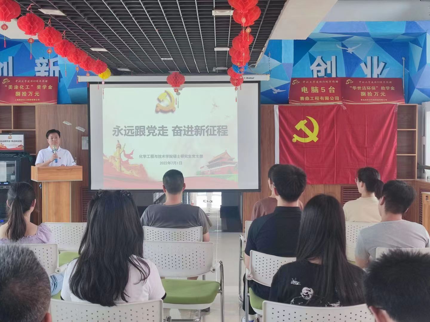 今天是中国共产党成立101周年纪念日,今年也是党的二十大召开之年,伟大的中国共产党,已经走过了一百多个年头。为全面回顾中国共产党建党101年以来走过的光辉历程,激励高校基层党组织和广大党员充分发挥战斗堡垒和先锋模范作用,化学工程与技术学院硕士研究生党支部于2022年7月1日在科学楼C座七层连廊,开展庆祝中国共产党成立101周年“永远跟党走,奋进新征程”活动。学院党委书记廖海洪,党支部书记贾苗苗,硕士研究生党支部全体党员、入党积极分子、部分共青团员及群众参会。
