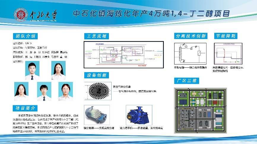 师生刻苦训练、反复研讨,在工艺路线、分离技术、过程节能、设备设计、资源利用、环保、安全、经济等进行多方面创新设计,使用多种现代设计方法设计了一座充分反映新时代化工设计理念的1,4-丁二醇生产装置项目。
