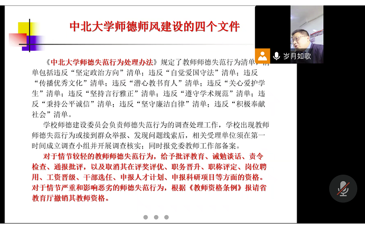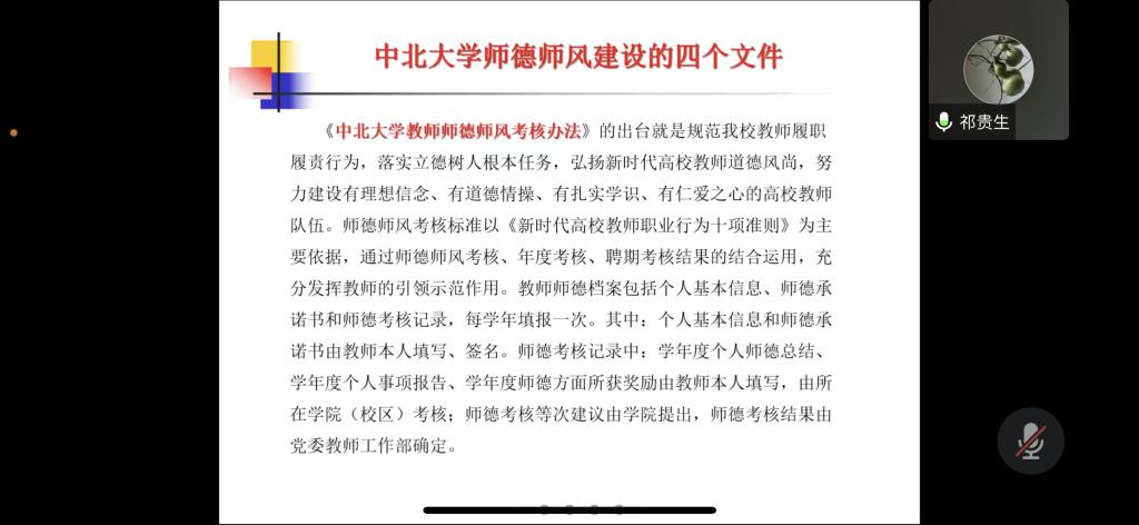 会上祁贵生院长、王建龙、王艳红、朱海林、马忠平、李永祥、任福德等老师先后发言,谈了对本专业在师德师风方面的看法和建议,要求老师对照学校的师德师风要求的文件,开展自查自纠,相互监督,对于师德失范行为敢于揭露,建立了学习制度、严格落实、树立师范、潜移墨化的师德师风的长效机制。