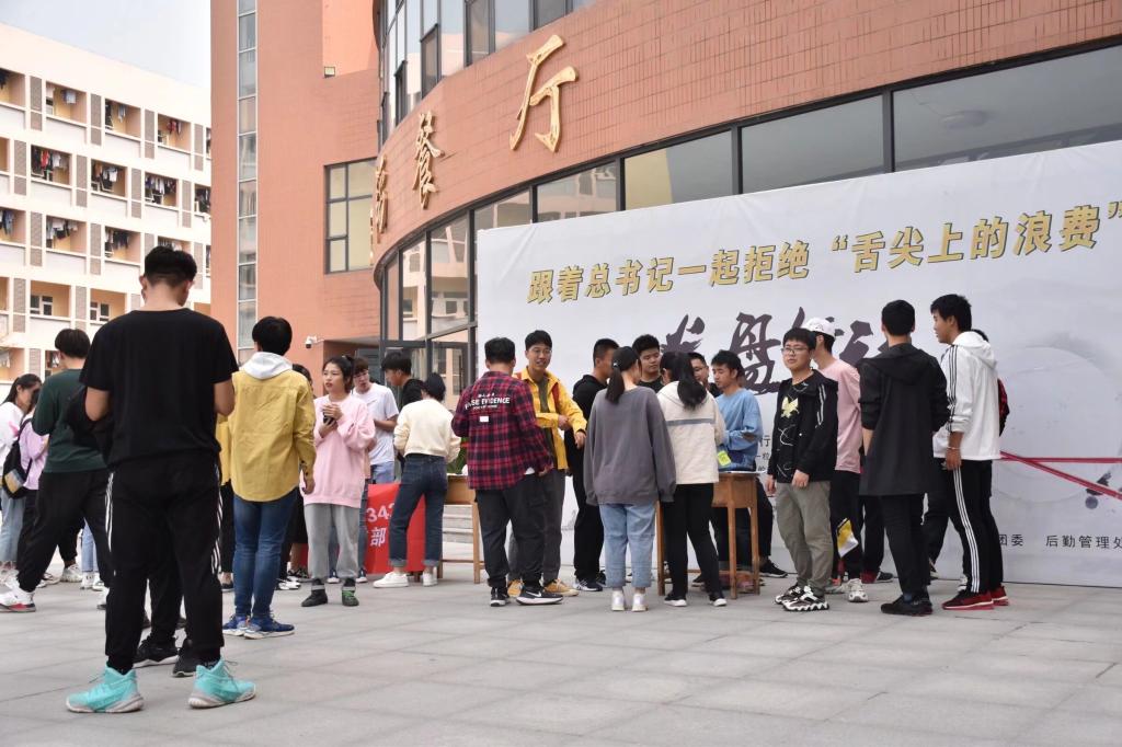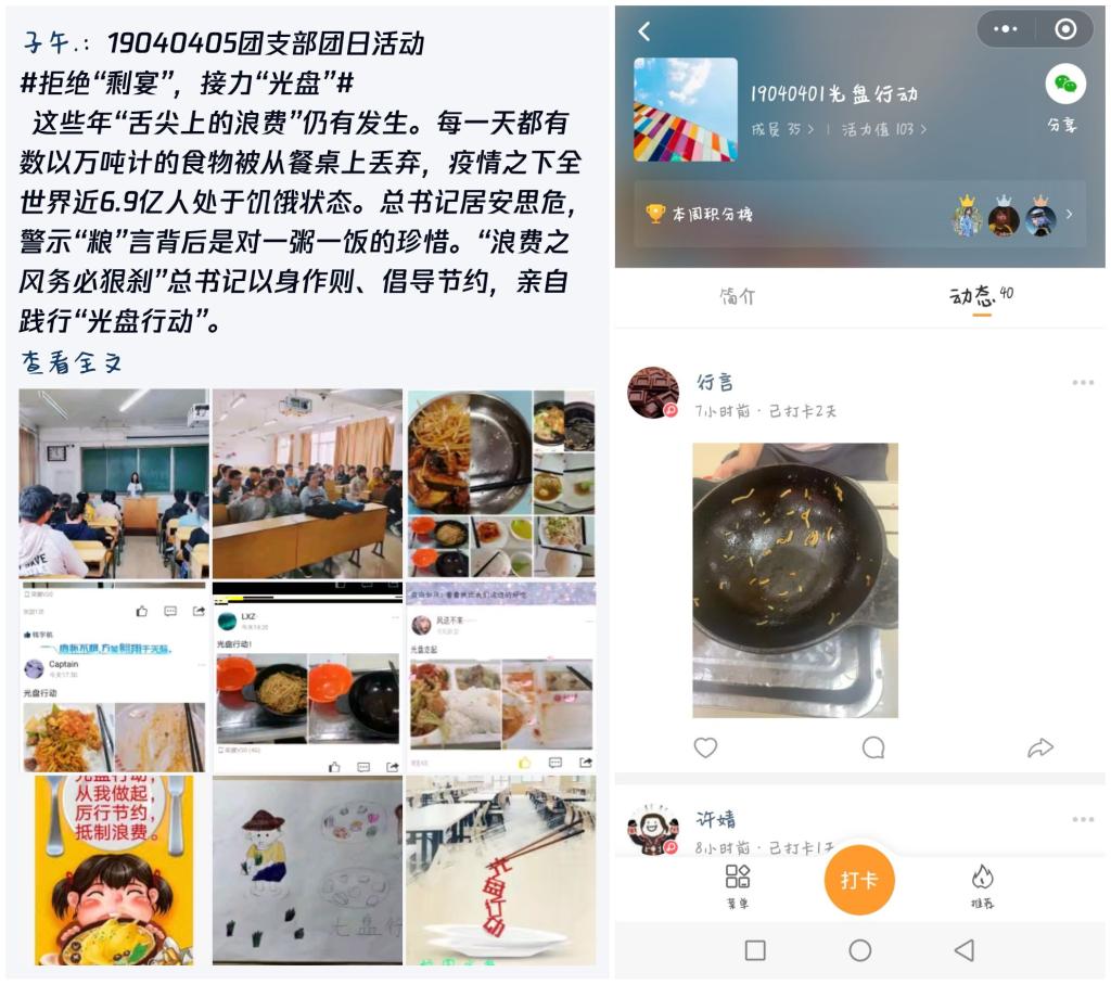 本次团日活动首先召集各团支部书记对活动进行部署,通过审核每个团支部的活动策划方案,确保了团日活动的有序开展和进行。团日活动开展形式各样,不仅在线上开展了“光盘行动”打卡活动,号召支部成员将吃完食物的空碗空盘拍照上传,借此相互监督,促进节约粮食习惯的形成,组织关于“光盘行动”知识竞赛和问卷调查,线下也开展了“拒绝舌尖上的浪费”团日活动主题活动,科普浪费粮食的危害,解读节约粮食的重要意义。同时号召各团员在“坚决制止学校餐饮浪费行为”专项活动启动仪式签字墙上签名,配合在线上线下对“光盘行动”理念进行宣传,动员更多人宣传和参与活动。此次团日活动形式多样,宣传范围广,参与度高,全方位地将节约粮食的理念根植进广大群众心中。